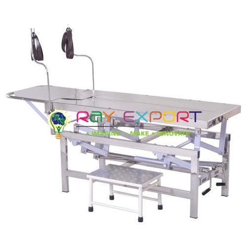 General Size L 1820mm x W 560 mm x Ht. Flexible from 750mm to 920 mm Stainless steel top with kidney connect Detachable and collapsing foot end. Stature Adjustment and head low/up position by screw and lever instrument. Pre-treated and epoxy powder covered. Accessible in hardened steel top epoxy powder covered base/S.S. base.