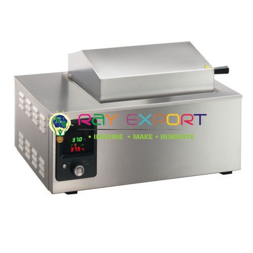 Paraffin Bath; The Paraffin Section Mounting Bath is intended to help with the treatment of paraffin wax tests in histology and pathology research centers. It is basically a hot refined water skimming out shower that takes into account the fastidious control and area of paraffin wax segments onto glass slides. In case of having any harmed areas or an abundance of wax, both might be effectively expelled by skimming a channel paper over the water surface. A white neon light shows "Power On" and a golden neon light demonstrates "Heater On". The required temperature is chosen utilizing the warmer dial and an ostensible temperature of 70°C is ordinarily accomplished with 2 liters of water inside 120 minutes. Exact water temperature is then kept up through a vitality controller which supplies energy to a silicone elastic tangle in controlled planned heartbeats. Over-warming of the shower is averted by a warm wire inside the warmer tangle which naturally removes at too high a temperature. The Paraffin Section Mounting Bath has a PTFE dark inside and powder-covered aluminum outside, which makes it practically support free and to a great degree simple to clean. It comes provided with an IEC shaped rope and lead set and the IEC attachment houses assurance wires for both the live and impartial power supply lines. In the event that required, the cover is provided independently as part number AZ9241. Key Features • PTFE dark inside and powder-covered white aluminum outside • Virtually support free and to a great degree simple to clean • Excess or harmed segments might be essentially expelled by skimming a channel paper over the water surface • 70°C ostensible temperature for 2 liters water, accomplished inside 120 minutes Warranty: Multi year parts and work Certification: CE Technical Specification Bath material Aluminum base with PTFE covered inside Temperature Ambient + 5°C to 75°C utilizing subjective 1-10 scale Dimensions (d x w x h), mm 330 x 330 x 140 Weight, kg 2.7.