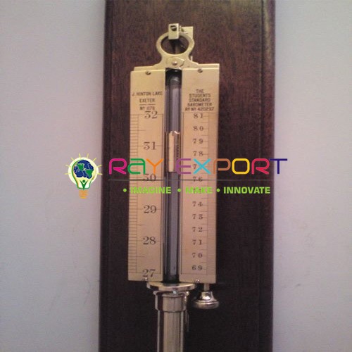 A glass tube of 6mm bore is cased in an enamelled and lacquered brass case ,standing on a finished wooden board with plates fitted on wall. Open plate reflectors, nuts and bolts for vertical adjustments. A dual scale graduated in 25 to 32 inches and 640 to 810mm is read by verniers moving by rack and pinion, reading to 0.002 inch and 0.1mm are encased in a glass cylinder. A glass cistern at the lower end of barometer is provided with an ivory point to fix the level of mercury. A thermometer -10 to 50°C is placed on the wooden board.