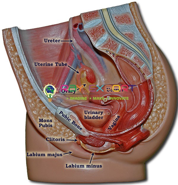Life estimate, right 50% of the pelvis demonstrating female regenerative organs, bladder, uterus, rectum and ovary.