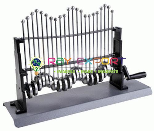 For exhibiting longitudinal and transverse movement, comprising of 18 acentric Aluminum circle supporting a progression of metal bars. On rotating the handle, transverse waves are acquired with bowed, straight poles. Finish on wooden box.