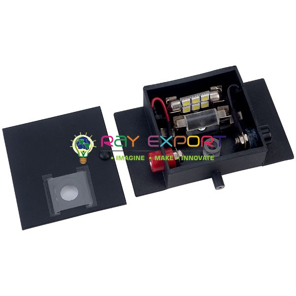 For showing Brownian movement. Intended for use with a magnifying instrument. A short barrel shaped cell, shut by a cover glass, is held vertically in a hazy channel 90x90x30mm. Light is by an indispensable fiber globule and barrel shaped glass focal point. The cell empowers Brownian movement to be watched for no less than 15 minutes in the wake of accusing the cell of smoke. Fitted with 4mm attachment terminals for association with 12V supply.