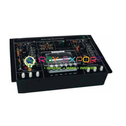 Equipment for Education, Engineering and Vocational Training - Stereo Tape Recorder Trainer & Lab Training Kit - Stereo Tape Recorder Trainer is ideal equipment to teach the operation of stereo recording and stereo cassette playing function. The comprehensive study of Tape record and Mechanism unit technique is described in the operating manual. One of the main features of this trainer is fault simulation. The fault created in the trainer in no way damages the trainer. Technical Specifications Amplifier Type : Class B amplifier Audio Power Output : 14 W (7 W × 2 channels ) Frequency Response : 100 Hz to 8 KHz Tape Speed : 4.75 cm / sec Erase Head : Fix magnet RP Head : YBBT 62 (Stereo) Mechanism : R X 39 Motor : CCW 12 V DC Circuit Block : Pre amplifier CH-L & CH-R Bass - Treble CH-L & CH-R Output amplifier CH-L & CH-R Equalization CH-L & CH-R Output level indicator section Power supply section Panel Control : Volume CH-L & CH-R Bass CH-L & CH-R Treble CH-L & CH-R Mechanism Control : Record, Play, Reverse, Forward, Stop, Pause Recording Facility : Condenser Mic and EP socket for feeding external signal PCB Size (mm) : 260 × 230 No. of faults : 15 No. of Test point : 42 Power Supply : 220 V ±10 %, 50 Hz / 60 Hz on request Power Consumption : 8.17 W (approx.) Compact design Fault creation and diagnosis 42 Test Points More than 15 faults can be demonstrated on this trainer No soldering and de-soldering is required to simulate faults The main IC's are provided on socket to provide a facility to check similar IC' and also to create the faults by inserting faulty IC's in the sockets Test points detail with typical voltage and wave forms are provided in the manual In built power supply Two identical mono channels clubbed together to obtain stereo effect through stereo head Both internal and external recording facility available Recording process understood through LED indicator present in equalization section 8P-2W R/P switch mechanism planed widely through 16 nos 1P-2W toggle switches Separate bass/treble section to understand the effect of low frequency as well as high frequency signal.