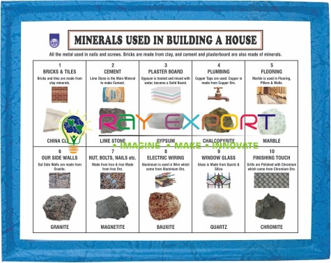 This Collection contains 10 Types of Minerals Specimens Used in Building a House for Bricks, Tiles, Plaster, Plumbing, Flooring, Out Side Walls, Nut, Bolts, Nails, Electric Wiring, Window Glass & for Finishing Touch. This Kit includes Some of the following Minerals China Clay, Lime Stone, Gypsum, Chalcopyrite, Marble, Granite, Magnetite, Bauxite, Quartz & Chromite etc.