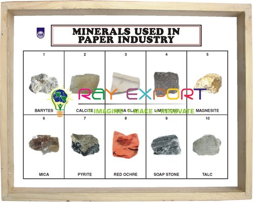 This Collection contains 10 Types of Minerals Specimens Used in Paper Industry. This Kit includes Some of the following Minerals Barytes, Calcite, China Clay, Lime Stone, Magnesite, Mica, Pyrite, Red Ochre, Soap Stone & Talc etc.