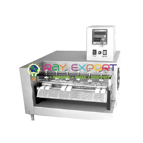 Ross Flex Tester - The capacity of elastic vulcanizates to oppose split development of a punctured example when subjected to rehashed bowing can be assessed with the assistance of a Ross Flex Tester. The& Ross Flex Tester comprises of a course of action to hold one end of the test examples in a wavering grasp to such an extent that they can be twisted through an edge of 90° at the predetermined recurrence, and customizable guide rollers to keep the free end of the test examples pushed down amid the bowing tasks. and The example grasp has arrangement for holding six sets of test examples at once. The grasp is turned on two metal rollers to give a smooth low-grinding development. Development of the grasp causes test examples to twist around a silver steel ground bar with its hub matching with the hub of development of the hold. The development is given by an engine and V-belts through an unpredictable and connection system. An electronic computerized counter with reinforcement memory is given to record the aggregate quantities of twisting cycles..