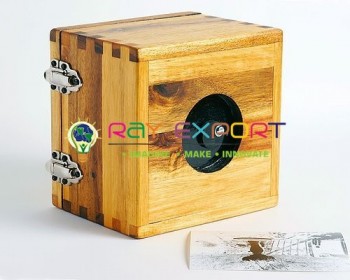 Two rectangular, open finished, light verification wood boxes. One slides into the other and contains an iced translucent glass plate whereupon picture is shaped.