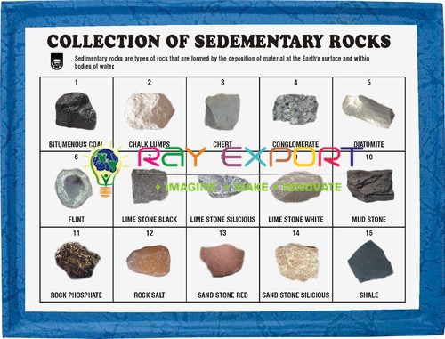 This Collection contains 15 Types of Basic Rocks Specimens of Sedimentary Rocks Types.The Sedimentary Rock Specimens include Some of the following Bituminous Coal, Chalk, Chert, Conglomerate, Diatomite, Flint, Lime Stone, Mud Stone, Rock Phosphate, Rock Salt, Sand Stone & Shale etc.