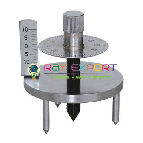 Spherometer-Double Disc Lab Equipment Manufacturer, Supplier and Exporter in IndiaCatalogue No : L-0059It comprises of a circular metal table 50mm diameter with three accurately positioned black painted steel legs and ordinary steel screw thread working in long adjustable brass bearing. A circular scale is carried on the thread and a scale on the table, enabling the user take accurate micrometer type readings. |
